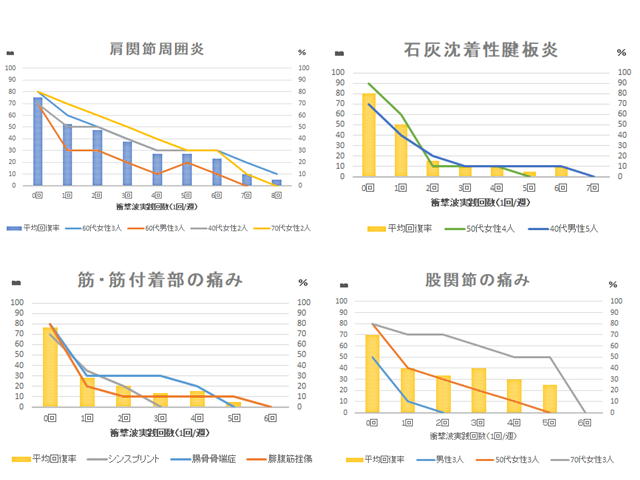 ビジュアル・アナログ・スケール(VAS:visual analogue scale) 紙の上に10cmの線を引いて、左端に0(全く痛みなし)、右端に100(今までで一番強い痛み)と書きます。患者さんに「あなたの痛みはどれくらいですか?」と質問して、0〜100の間のどのあたりになるのかを指し示してもらうことによって、痛みを評価します。 当院治療成績(6か月間 H31年10月~R1年6月)